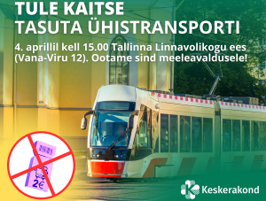 Eesti Keskerakond korraldab neljapäeval, 4. aprillil kell 15 Tallinna Linnavolikogu ees (Vana-Viru 12) meeleavalduse tasuta ühistranspordi kaitseks, sest Tallinnas võimukõnelusi juhtiva Reformierakonna esindajad on teatanud, et soovivad võimule saades kaotada ka pealinnas tasuta ühistranspordi.
